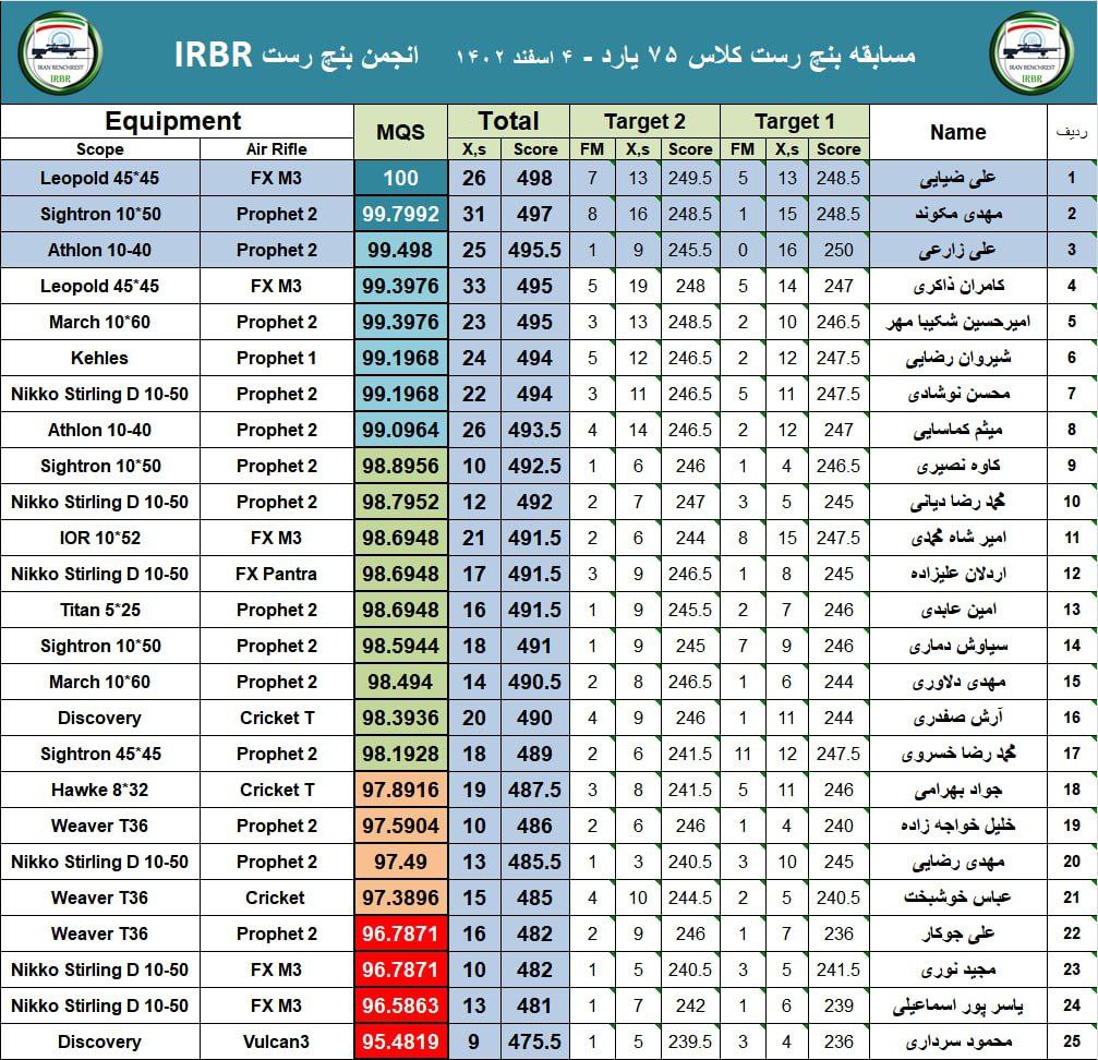 مسابقه تیراندازی بنچ رست ۷۵ یارد – IRBR – تاریخ ۴ اسفند ۱۴۰۲ میثم کماسایی 26 بهمن 1402|07:34 زمان تخمینی مطالعه: 1 دقیقه مسابقه تیراندازی بنچ رست ۷۵ یارد – IRBR – تاریخ ۴ اسفند ۱۴۰۲ گالری مسابقه ۷۵ یارد ۴ اسفند ۱۴۰۲ نفرات برتر مسابقه بنچ رست ۷۵ یارد انجمن بنچ رست IRBRجمعه ۴ اسفند ۱۴۰۲آقایان :🥇علی ضیائی با امتیاز ۴۹۸. 26X🥈مهدی مکوند با امتیاز ۴۹۷. 31X🥉علی زارعی با امتیاز ۴۹۵.۵. 25X اشتراک گذاری اشتراکگذاری این مطلب را با دوستان خود به اشتراک بگذارید! کپی کردن لینک