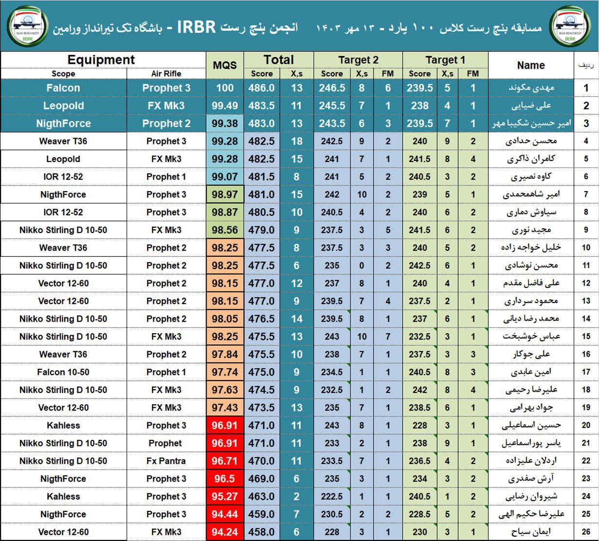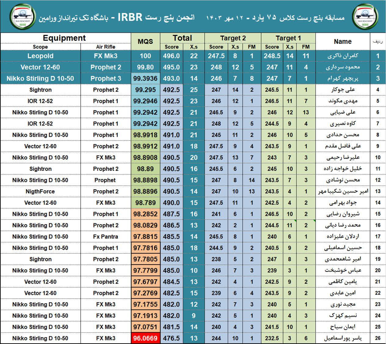نفرات برتر کمپ مسابقه لانگ رنج انجمن بنچ رست IRBR – کلاس ۷۵ یارد